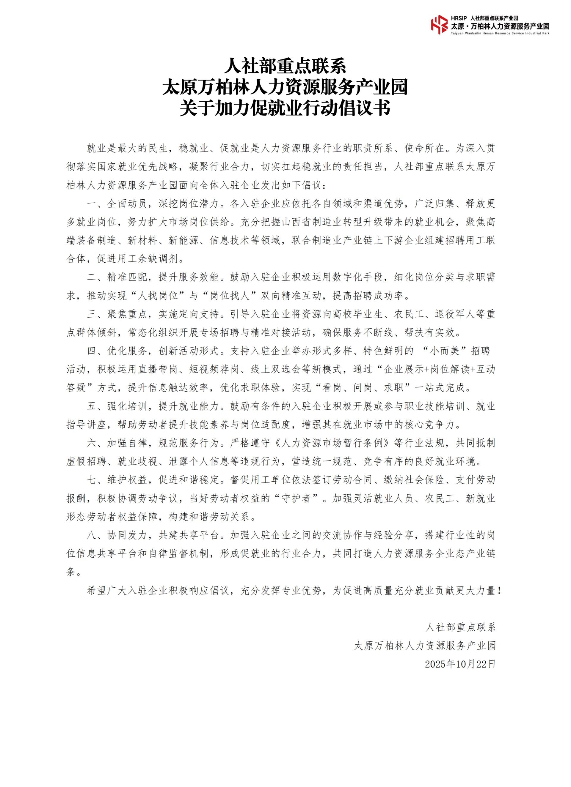 人社部重点联系太原万柏林人力资源服务产业园关于加力促就业行动倡议书