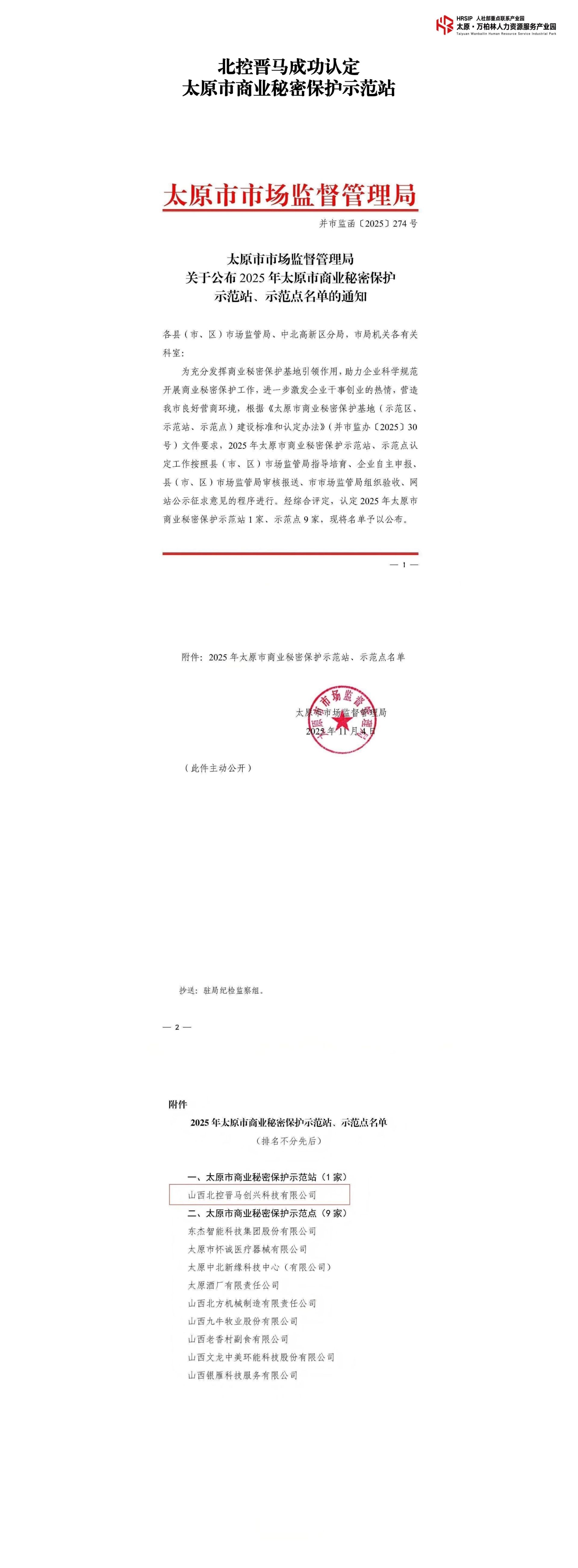 喜报 | 北控晋马成功认定太原市商业秘密保护示范站
