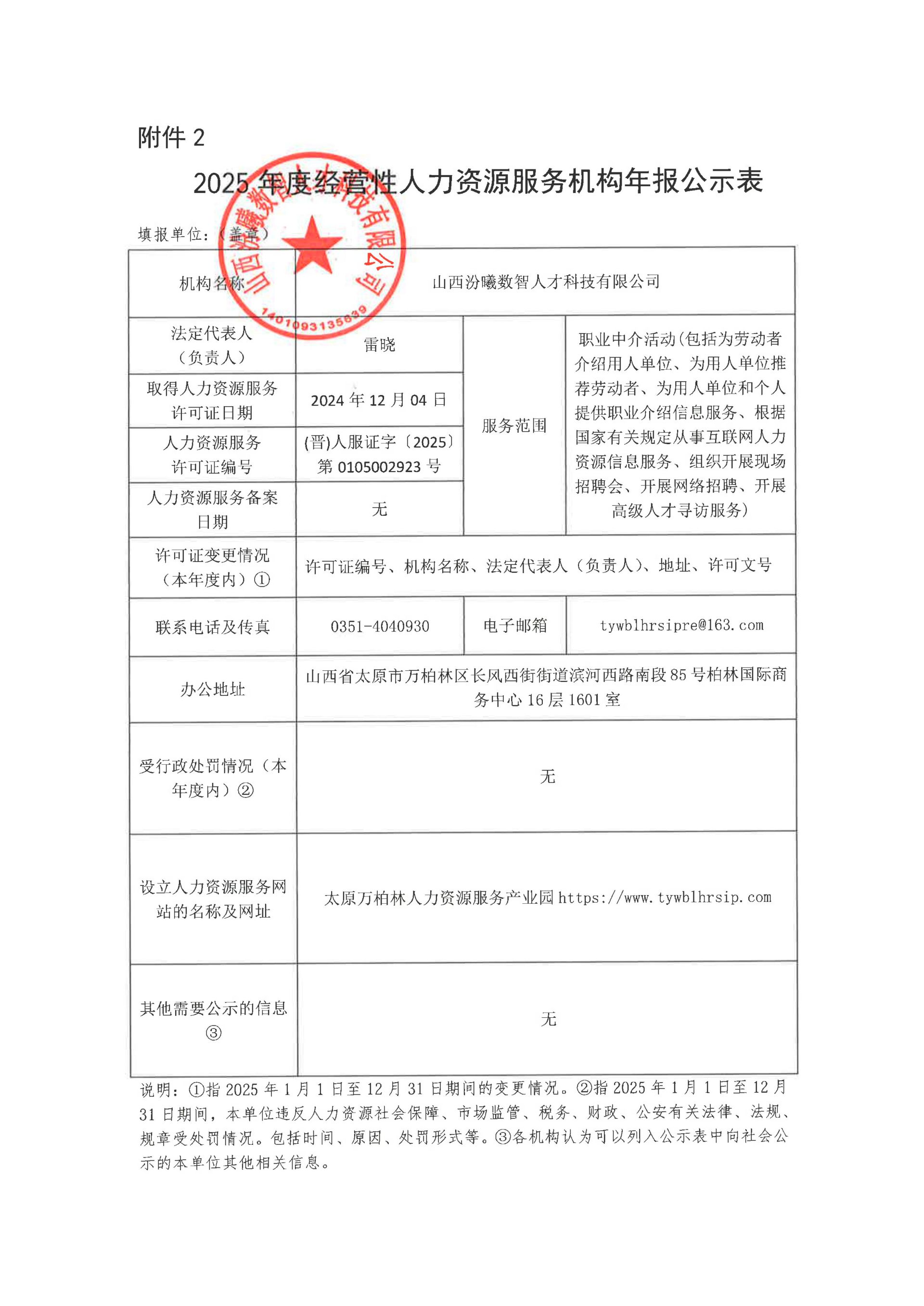 山西汾曦数智人才科技有限公司2025年度经营性人力资源服务机构年报公示表